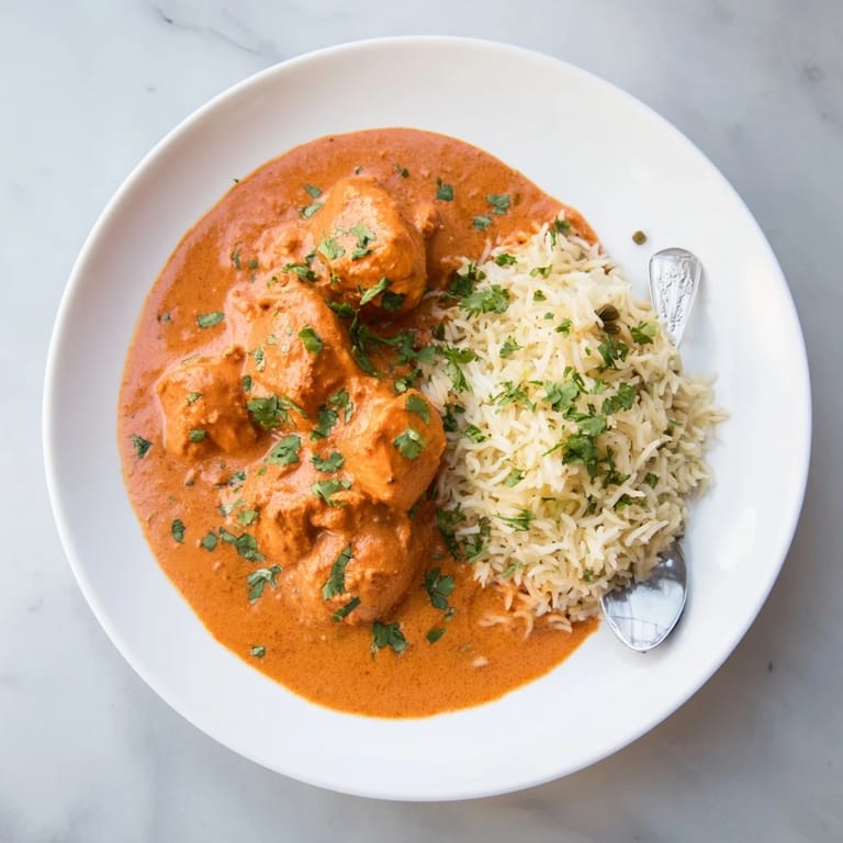 Save A classic Indian favorite featuring tender chicken in a rich creamy tomato sauce paired with fragrant basmati rice pilaf. Perfect for a comforting meal full of flavor and spice.