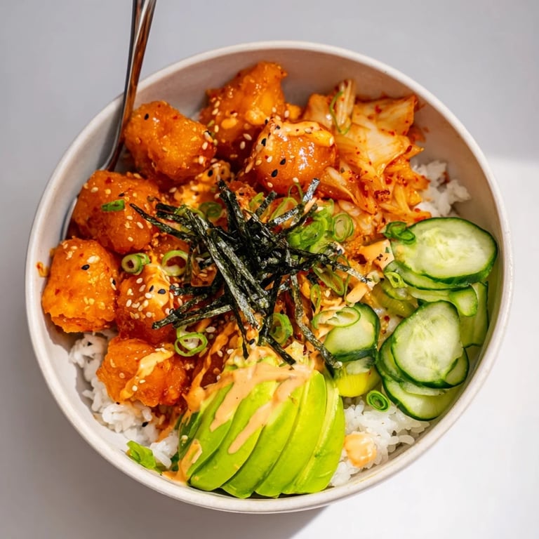Save A vibrant, flavor-packed bowl featuring crispy salmon, fluffy rice, spicy mayo, tangy kimchi, and savory garlic for a perfect balance of textures and tastes.