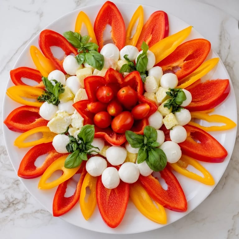 - 3. Arrange the red bell pepper strips in a circular, flower-petal pattern on a large round platter.