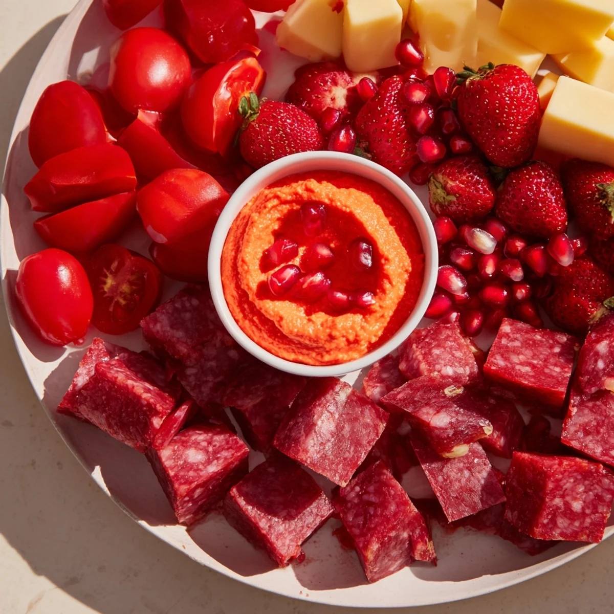 - Start with your red pepper hummus in a small bowl at the center of the red zone—this is your anchor, your focal point, your star. Now imagine you're placing jewels around a crown. Fan out the strawberries so their cut sides face forward, showing off their beautiful pink interiors. Scatter the cherry tomatoes like precious gemstones, ensuring they catch the light. Drop pomegranate arils into gaps like tiny rubies. Fold the soppressata slices gently and tuck them in for color contrast, then cube the red Gouda and position it so you can see the creamy interior. Fill any remaining gaps with dried cranberries, and finish with a few edible flowers if you have them. Step back. This section should look lush and intentional, with every element visible and nothing crowded together.