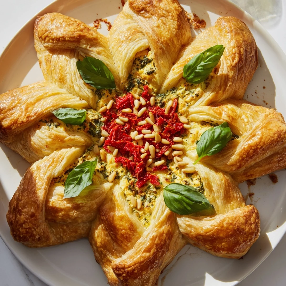 Save A festive and elegant savory pastry shaped like a poinsettia, filled with herbed cream cheese and sun-dried tomatoes—perfect for holiday entertaining.