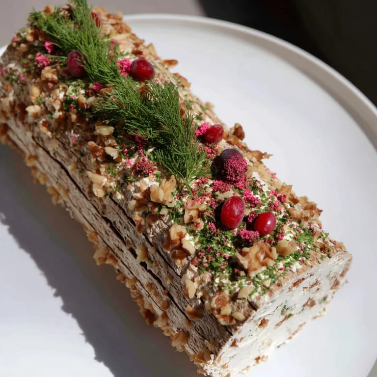 Save A festive, savory cheese log shaped and decorated like a holiday yule log, perfect as an elegant centerpiece for your holiday table. Creamy, tangy cheeses blended with herbs and nuts are enrobed in a rich, textured coating, then festooned with edible foliage for a stunning presentation.