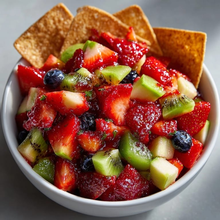 Save This vibrant fruit salsa with cinnamon sugar tortilla chips is my go-to whenever I need a crowd-pleasing snack or light dessert for summer parties or family movie nights. Every bite bursts with juicy berries and crunchy apples, and the warm chips are dangerously good straight from the oven. Kids love dipping or just eating the chips plain. Honestly it is hard not to finish it before the salsa hits the table.