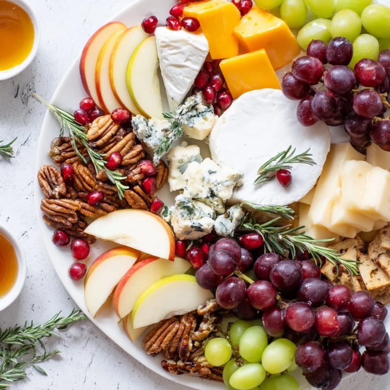 Save With a balanced mix of creamy brie, sharp cheddar, tangy blue cheese, and smooth goat cheese, this board offers something for everyone. Adding clusters of grapes, crisp apple and pear slices, and bursts of pomegranate seeds ensures freshness and vibrant color. Nuts, dried cranberries, and marinated olives fill in the spaces, creating an inviting array of textures and tastes.