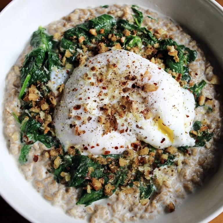 Save A hearty, visually appealing breakfast twist on classic oatmeal, featuring creamy oats, sautéed spinach, and a silky poached egg. Nutritious, budget-friendly, and satisfying.